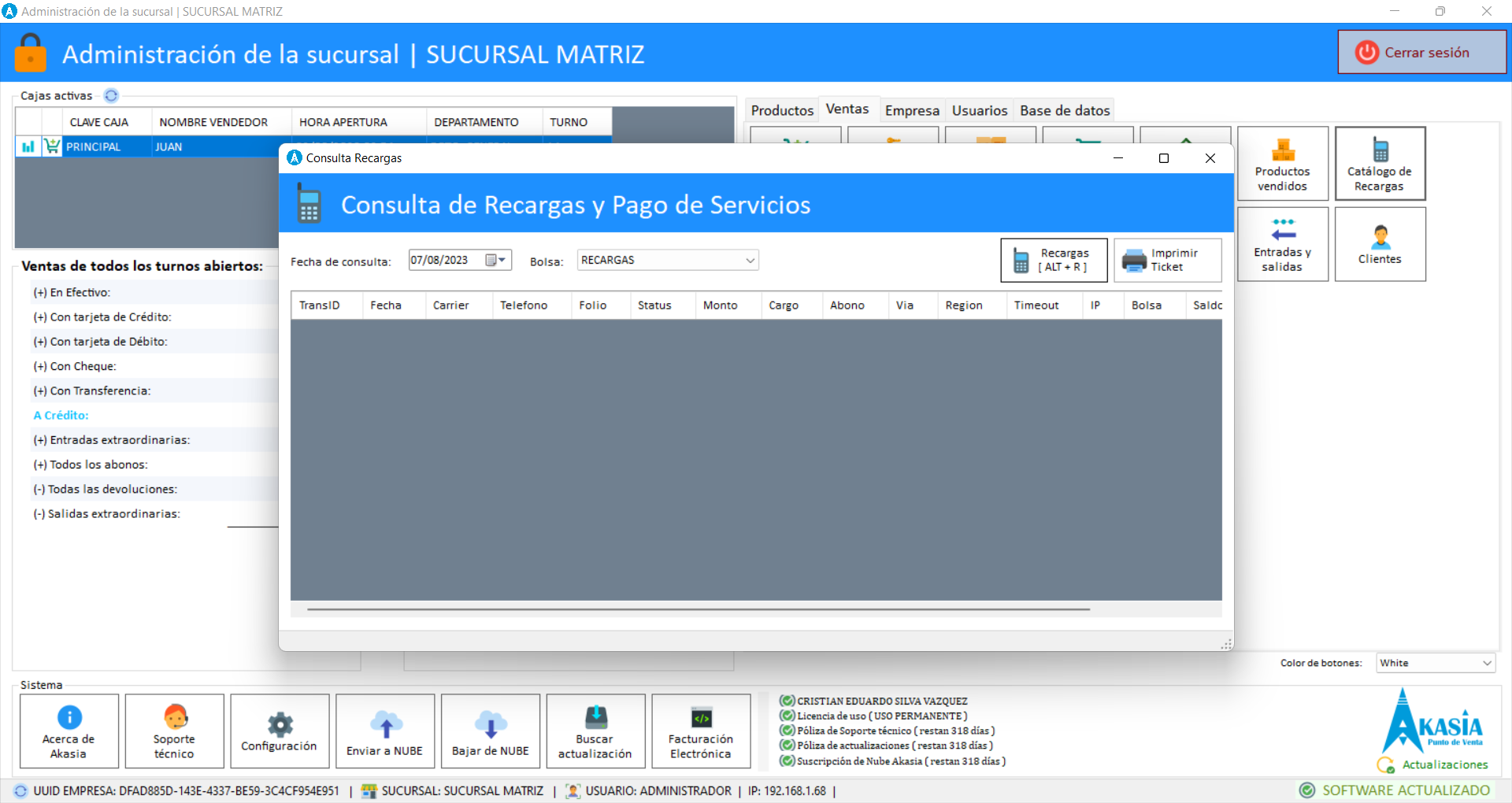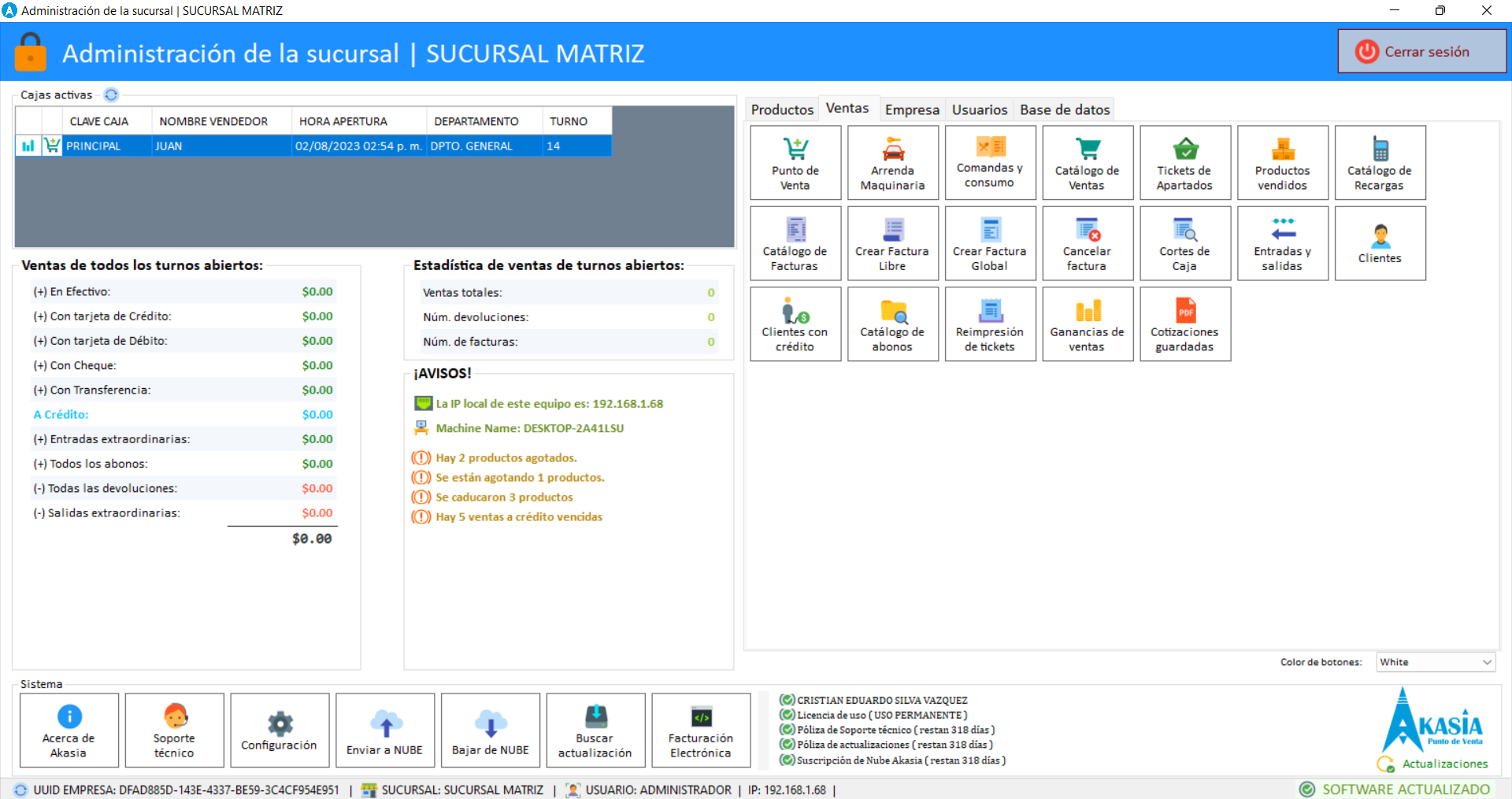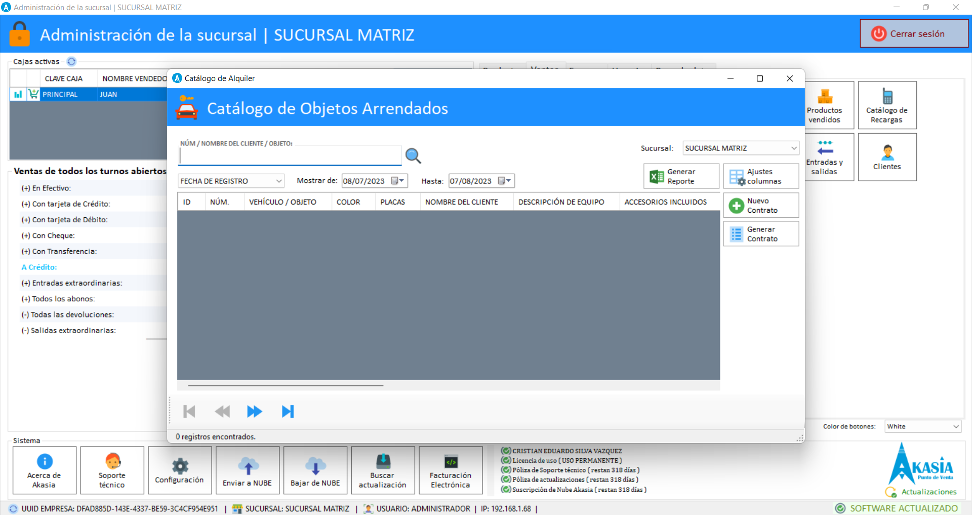 Akasia centraliza el control de las sucursales desde la matriz, puede consultar informes de ventas, facturas, estadísticas, bitácora, restringir usuarios, entre otras cosas.
