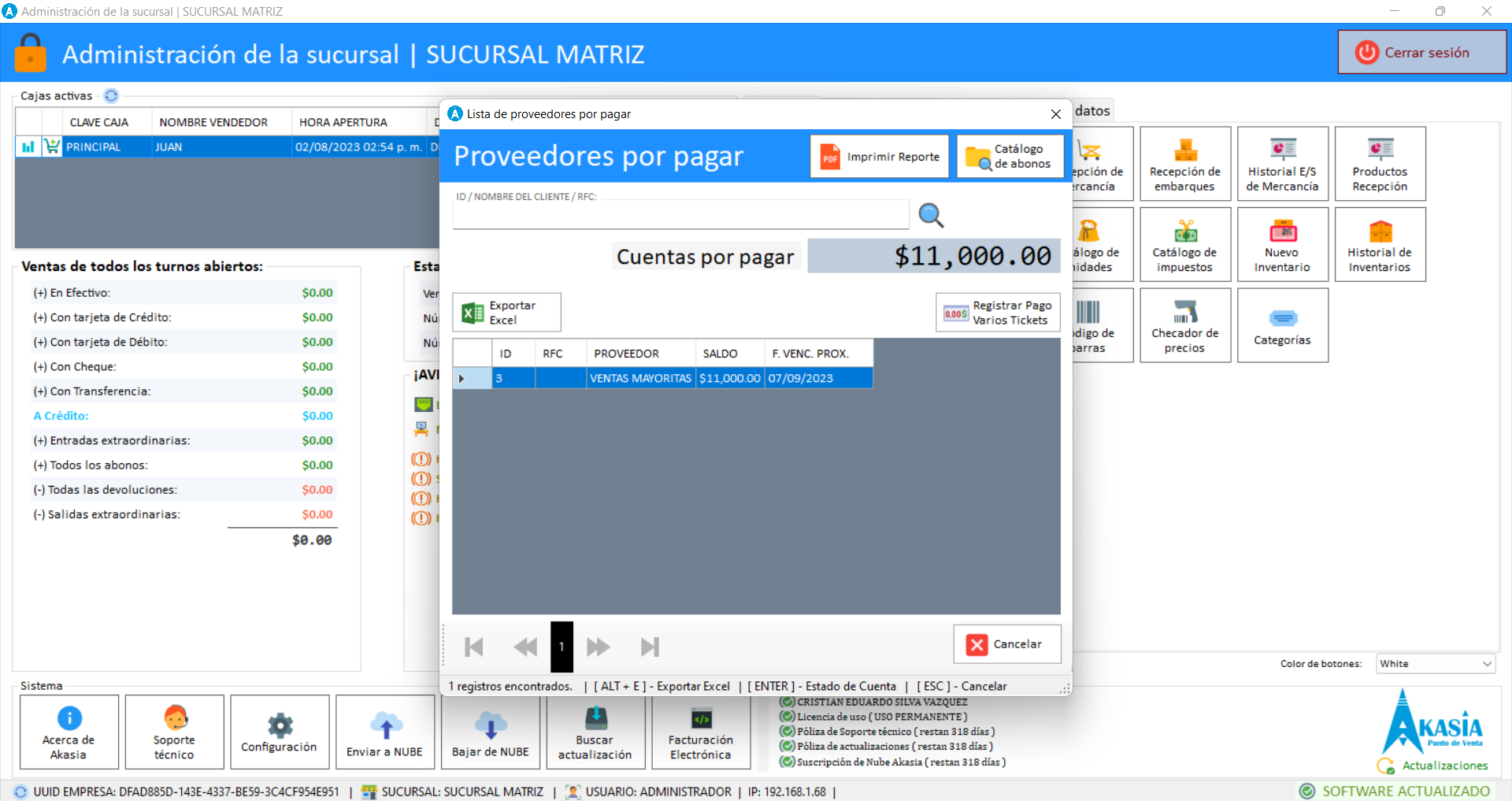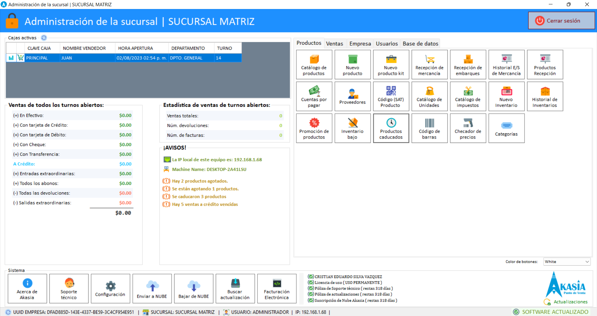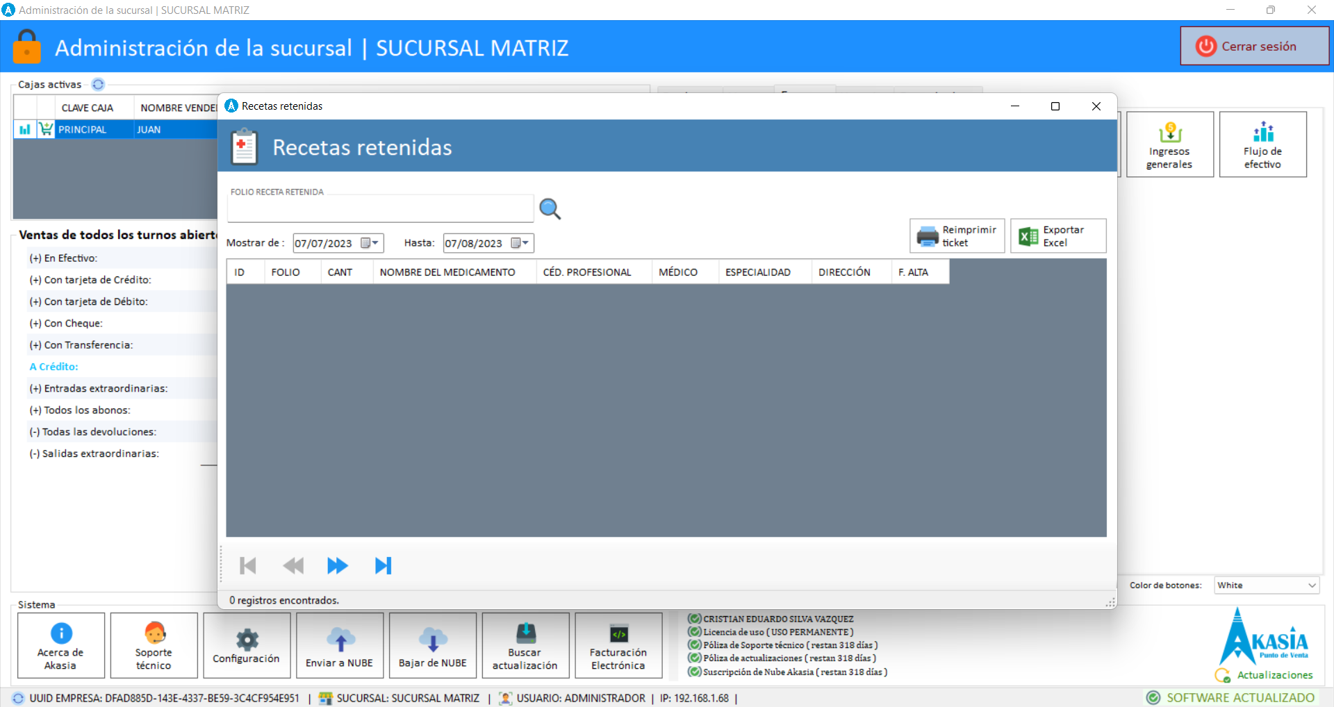 Akasia centraliza el control de las sucursales desde la matriz, puede consultar informes de ventas, facturas, estadísticas, bitácora, restringir usuarios, entre otras cosas.